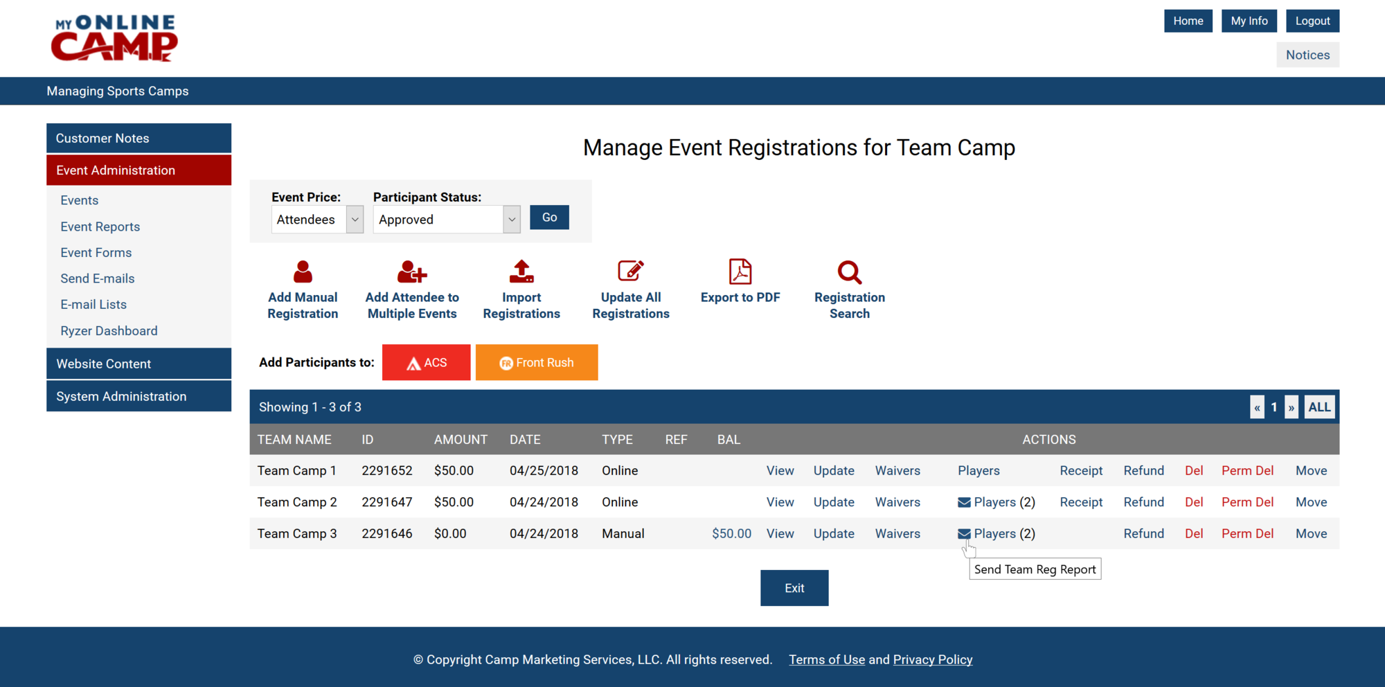 Teams or Players can be moved from one team camp event into another team camp event as either a Team or Player.