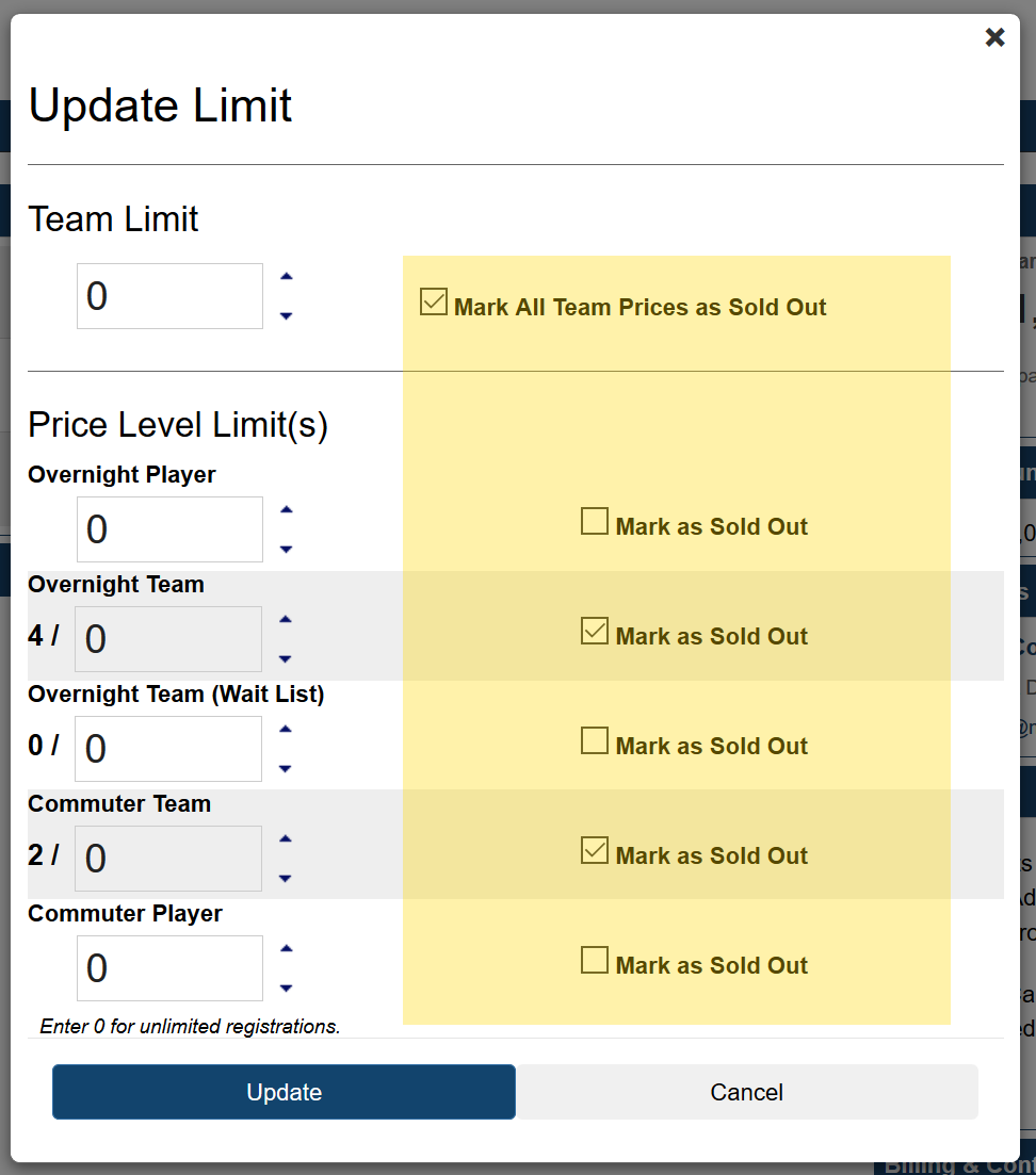 Within Team Camps on the dashboard when the # above Registrations is clicked within the modal an option to the right of the Team Camp Limit to Mark All Team Prices as Sold Out has been added.