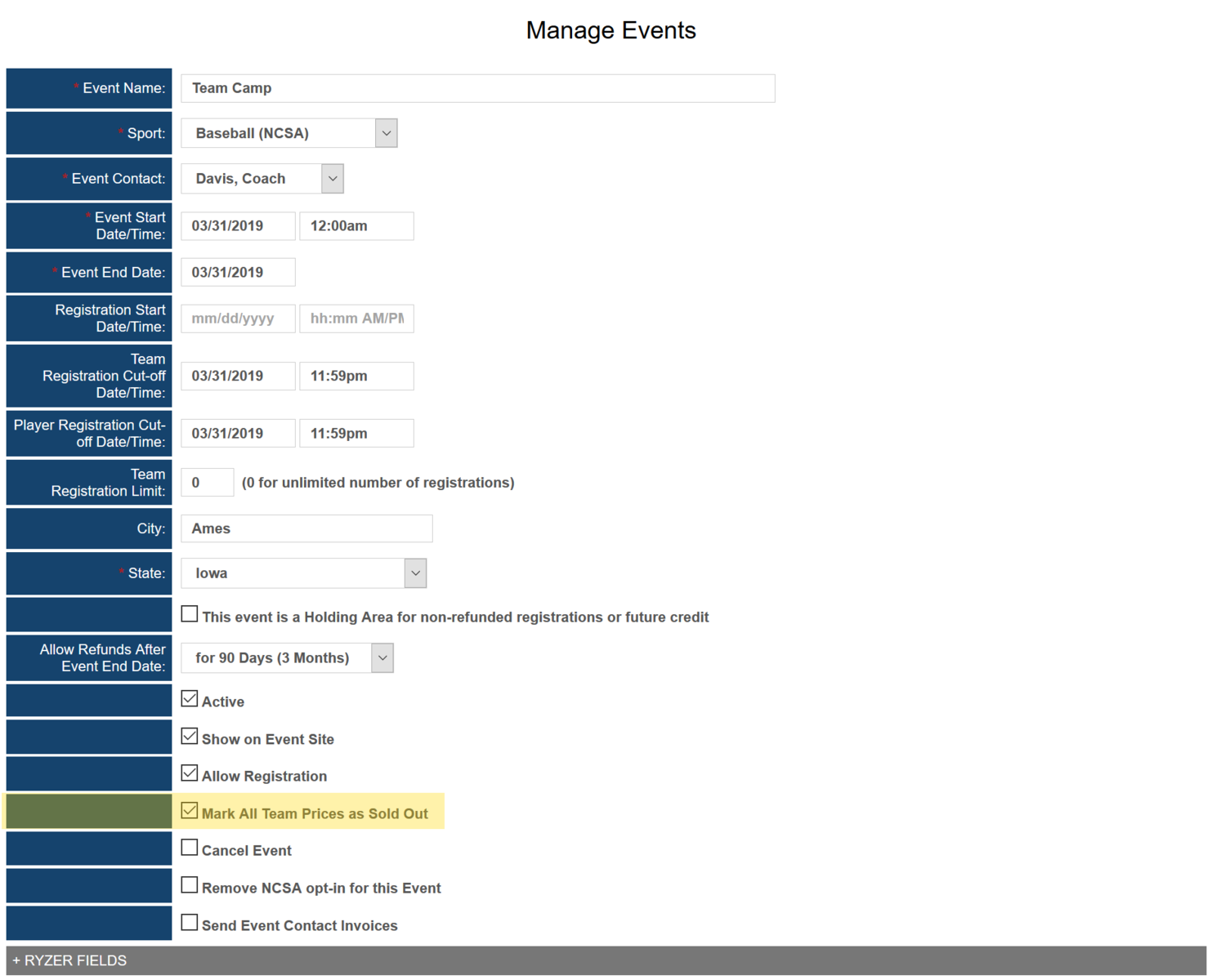 Within Team Camps when editing an event, a new checkbox right below Allow Registration has been added called Mark All Team Prices as Sold Out.