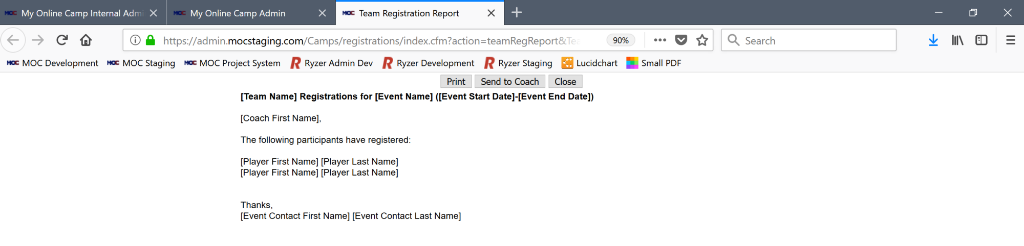 Within the registrations section of a team camp, if players have registered under a specific team. An envelope icon will appear, when this icon is clicked a new window will appear displaying the team registration report information for that given team. From this page, there is an option to send a copy of the team registration report to the coach.